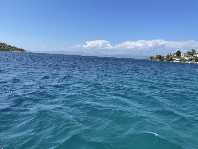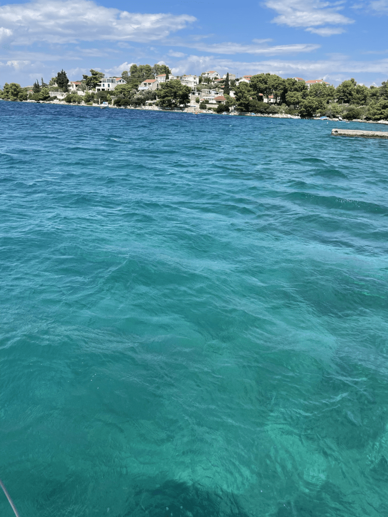 Am Freitagmorgen erreichte uns vom Vercharterer eine Starkwindwarnung, die wir in unseren Wetter-Apps so nicht erkennen konnten. Um sicherzugehen, entschieden wir, die Bura Line Hidden Bay in der Nähe unserer Zielmarina anzulaufen, um dort einen letzten Badestopp einzulegen, bevor wir zurück in unseren Zielhafen fahren. Nun, es stellte sich heraus, dass die Hidden Bay nicht sonderlich 'hidden' war. Bei unserer Ankunft war die Zahl der dortigen Boote nicht zu überblicken. Schade. Wir ankerten also vor (!) der Bucht für unseren Badestopp, kehrten aber am Mittag gegen 14:30 wieder zurück in die ACI Marina Trogir. Kaum war das Boot festgemacht, setzte der Starkwind ein. Außerdem begann gegenüber in der Altstadt ein lautstarkes Musikfestival. Gegen Mitternacht fand dieses jedoch ein frühes Ende aufgrund von starkem Regen. Dieser wollte auch bis zu unserem Rückflug nicht aufhören. Die erlebten 9 Stunden Regen (zumal bei Nacht) trübten unsere Segelreise jedoch nicht.