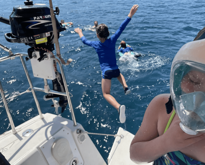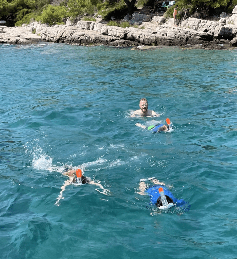 Nach der üblichen Sicherheitsunterweisung (den Kindern geschuldet dieses Mal umfangreicher), verblieben wir samstags noch in der Marina und überließen den anderen Crews das hektische Auslaufen. Erst am nächsten Morgen, nach etwas Spielzeit für die Kleinen, verließen wir gegen 10.15 Uhr die Marina Trogir. Erste Gehversuche auf See und auch erste Segelversuche führten uns Sonntagmittag zur ersten Badestelle. Schnell wurde geankert und das Schnorchel-Equipment bereitgemacht. Während die Kids mit zwei Erwachsenen im Wasser unterwegs waren, wurde an Bord das Mittagessen zubereitet, um die hungrigen Kinder schnell versorgen zu können. Nach gut zwei Stunden ging es dann weiter in Richtung Marina Milna (auf der Insel Brac). Unterwegs entdecken wir Delfine, welche als das tierische Highlight der Woche betrachtet wurden.