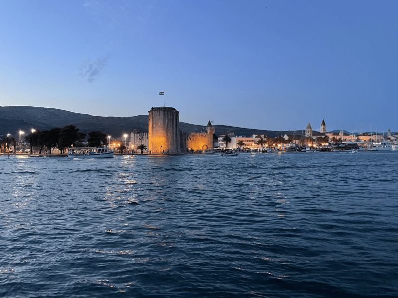 Donnerstag zielten wir nach dem Auslaufen wieder auf eine Badebucht. Hatten wir zwei Abende vorher noch eine mehr oder weniger verlassene Badebucht nutzen können, ankerten nun hunderte Boote (inkl. großer Touristendampfer) neben uns. Ankern war auf engem Raum hier eine Herausforderung, aber trotz der deutlich anderen Atmosphäre hatten wir auch hier unseren Spaß für ein paar Stunden. Gegen frühen Abend sind wir dann Richtung Marina Agana in der Bucht von Trogir gefahren. Die Erwartungen seitens des Skippers waren gering, wurden aber deutlich übertroffen. Hervorragende Infrastruktur und zahlreiche Gastronomieangebote bereiteten uns einen schönen Abend.